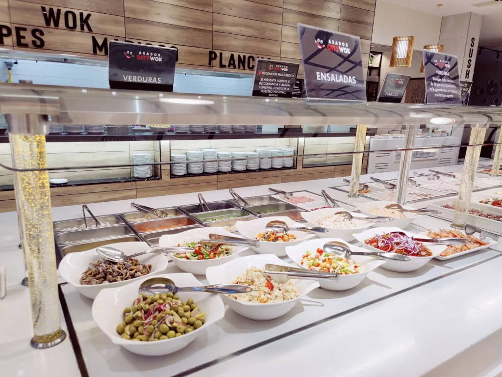 • Estación de entrantes: Comienza tu experiencia con una amplia barra donde podrás crear tu ensalada perfecta con ingredientes de temporada, o deleitarte con entrantes frescos y ligeros que preparan tu paladar para lo que viene. Aquí encontrarás desde vegetales crujientes hasta opciones mediterráneas.